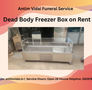 Dead Body Freezer Box on Rent in Noida | Antim Vidai Funeral Service Hum Dead Body Freezer Box on Rent in Noida provide karte hain, taaki antim sanskar se pehle sharir ko surakshit aur hygienic condition mein rakha ja sake. Hamare freezer box temperature control ke saath 24Γ7 available hote hain aur ghar, hospital ya mortuary ke liye suitable hain. π Service Areas β Noida Sector 62, Sector 63, Sector 18, Sector 50, Sector 51, Sector 75, Sector 76, Sector 78, Sector 93, Sector 94, Sector 128, Sector 137, Noida Extension & nearby areas. Samvedansheel samay mein hum quick delivery, clean freezer box aur professional support provide karte hain.